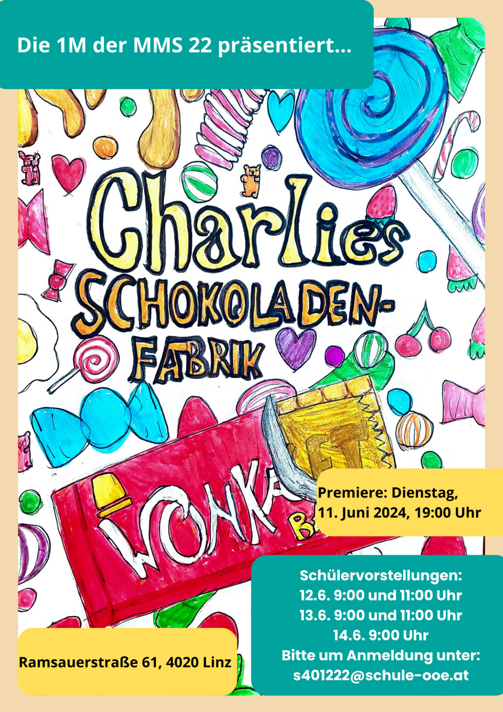 Auch dieses Jahr führt die 1M wieder ein Kindermusical auf. Dieses Mal sollen Sie Charlie, Willy Wonka und seine Schokoladenfabrik verzaubern.